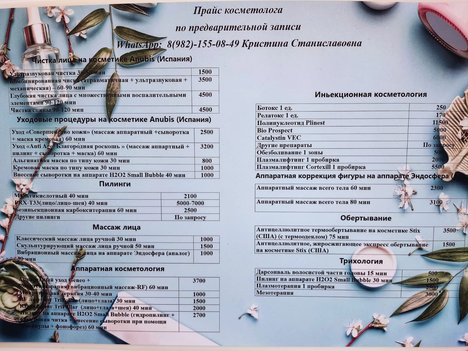 Обязательна предварительная запись по телефону +7 (982) 155-08-49 на желаемую дату, минимум за 3–5 дней, с указанием контактных данных клиента (телефон и имя клиента) (запись ведет практикующий мастер, если телефон не отвечает, просьба написать в WhatsApp или вам перезвонят).